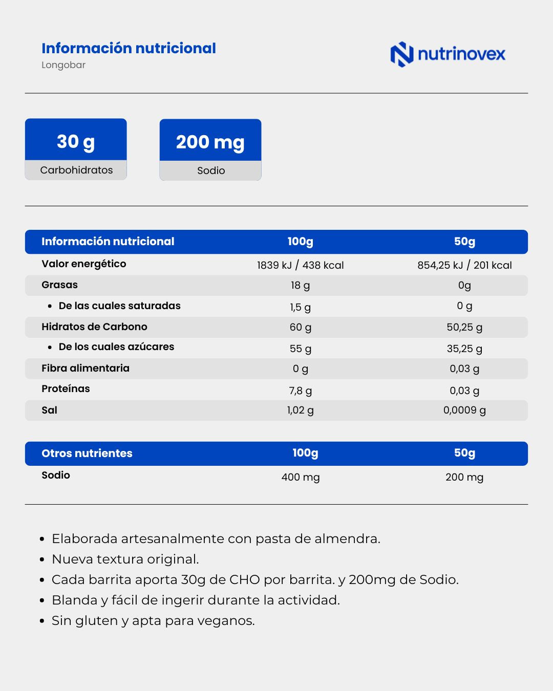 Toma una Longobar antes o durante el ejercicio, especialmente en sesiones o competiciones de larga duración. Su formato cómodo y su textura agradable la hacen perfecta para mantener el ritmo sin interrupciones.